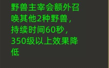 野性激发战弓,随机召唤另外2种野兽主宰,野兽主宰这个技能一共4个召唤物(狮王、幽灵豹、电狼、幽灵蟹),技能召唤根据雕文来,武器召唤是其他3个中随机2个