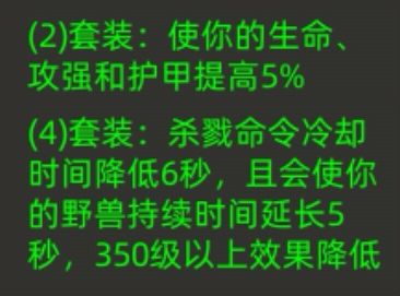 (4)套装:杀戮命令cd-6秒,野兽持续时间+6秒(野兽指的是野兽主宰技能召唤物)