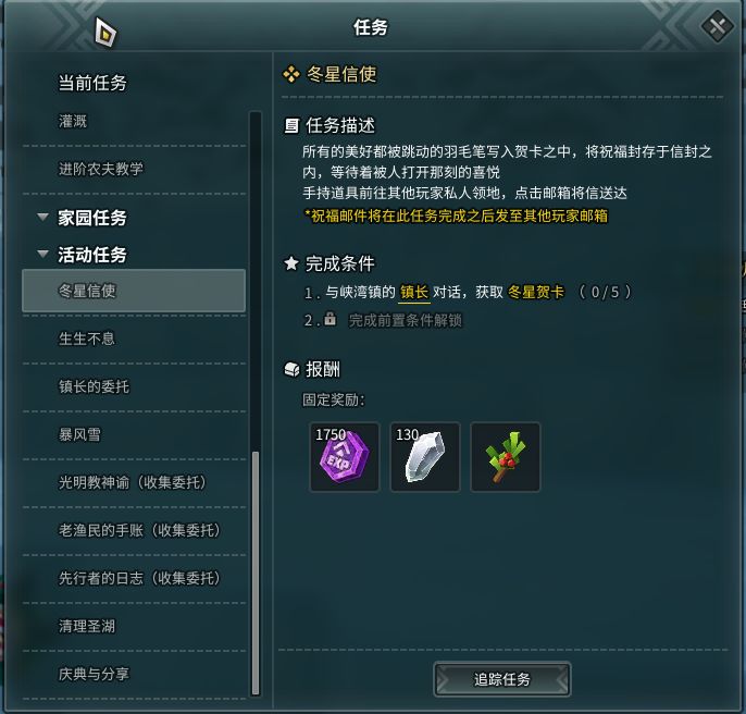 与镇长聊天可以获取冬星贺卡,邮寄信件后可以获得不错的报酬。*每日对同个私人领地仅可使用一次信封。完成任务后,可以获得冬星秘境通行证。