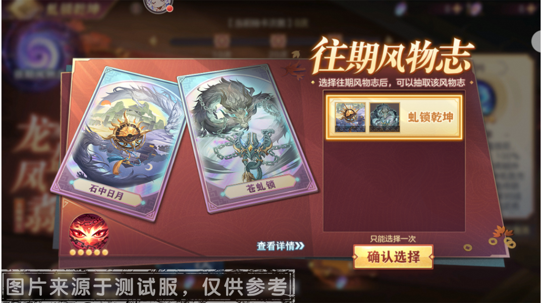 在抽取本期“龙盘凤翥” 主题风物志的的同时,小将军们还可以任意选择往期主题风物志,使用限时抽卡道具「坤灵令」或「乾清令」进行抽取,一旦确认选择将无法变更哦。选择完毕后可在左上角主题页签中切换当前主题或已选择的往期主题!