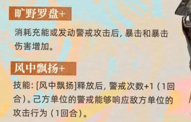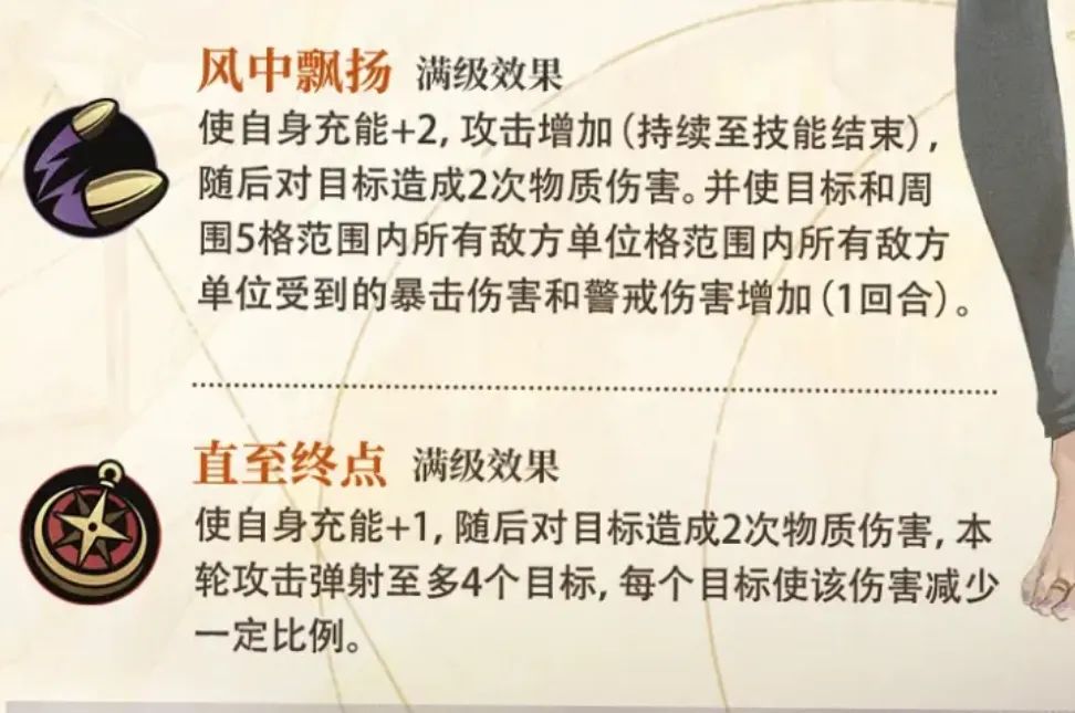 然后是劳拉的两个技能,1技能【风中飘摇】可以提升2点充能,满级后是30点能量,开局即可释放,能打对单伤害且答复提升这次技能伤害中的攻击力,并且在技能结束后还能使敌方5格范围内的敌人被施加受到的爆伤提升和警戒伤害提升的效果,因此从这个技能大家又能看到,劳拉其实也是一个主打警戒伤害的角色。