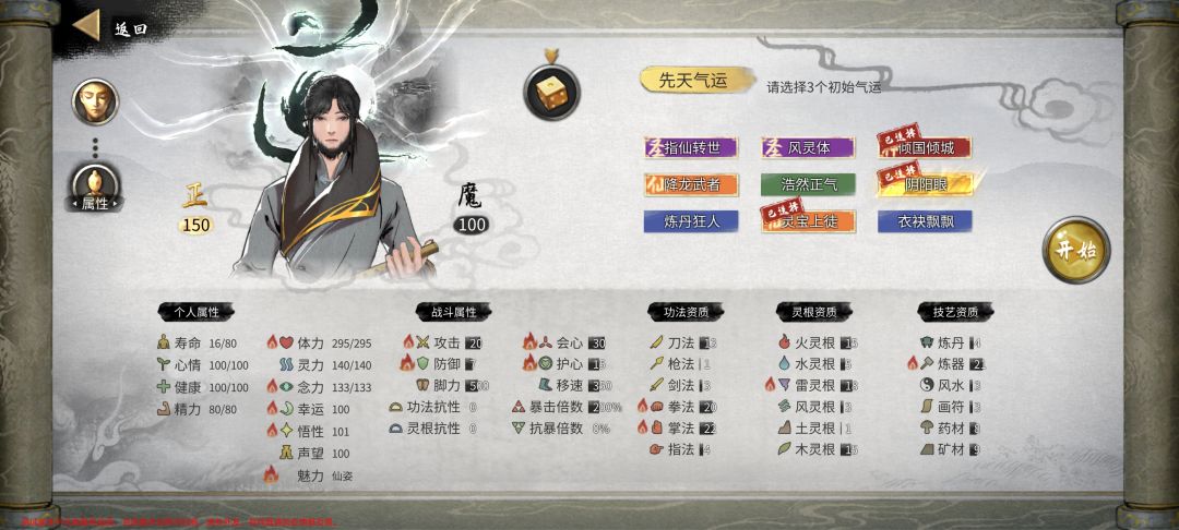 资质:在游戏中学习秘籍需要达到秘籍所需的境界与资质,两者缺一不可,资质同样影响技能洗点的回溯点数(回溯点的计算方式为:悟性+对应资质),还会影响到游戏开始时的平A方式,但是资质与悟性、幸运不同的时,资质可以在游戏内提升,提升方法还特别简单(吃果子就行)所以在Roll点的时候优先度低于上述两项。