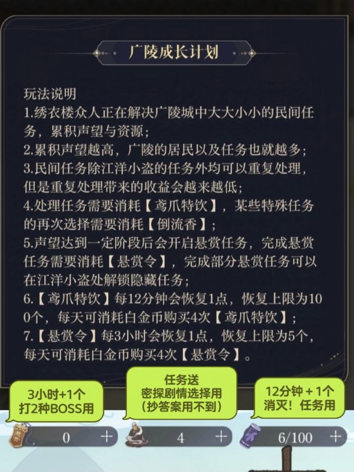 上线先想办法把广陵声望升🆙到2级,先做带宝箱(鼎)任务,非常容易达成,2级声望开启悬赏,然后随便做一个悬赏,你就可以安逸3小时。悬赏3小时恢复一点,特饮12分钟恢复一点,那么这就是你清空的情况下可以离线12*100=1200分钟即1200/60=20小时[暗中观察R]