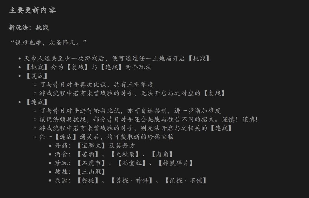 此次更新最重要的功能是追加了全新的「挑战」玩法,也就是大家常说的「BOSS RUSH」,必须至少通关一次游戏之后通过土地庙开启。简单来说就是跟数个 BOSS 级敌人连续战斗,中途不能补给,死亡一次就会失败,另外还可以选择各种禁制增加难度。在此模式下部分 BOSS 有全新招式,甚至能遇到跟主线流程中不一样的 BOSS,比如可以用天命人普通形态对战青狮形态的二郎神杨戬等等,非常值得一玩。