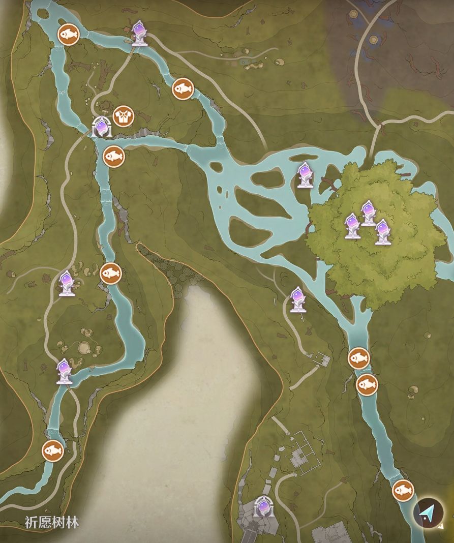 祈愿树林沿着河流,在图中标识出来的地方就是钓鱼点,大致就是各传送点附近。