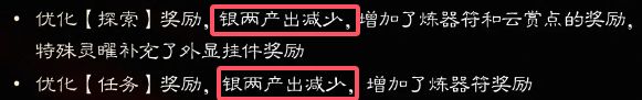 原因则是公测后任务和探索降低了银两的产出,从而增加了炼器符奖励。