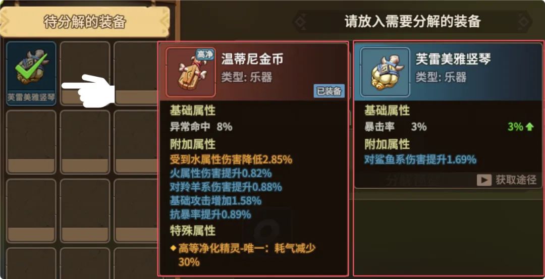 ②装备分解界面调整为界面中通过点击即可将当前选中装备的属性与已装备的装备属性进行对比,并增加装备备注的显示。