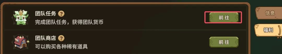 玩家可以组成最多为10人的团队,通过完成每周的团队任务获得团队活跃,团队活跃达标后可以领取团队币用于兑换游戏道具奖励。