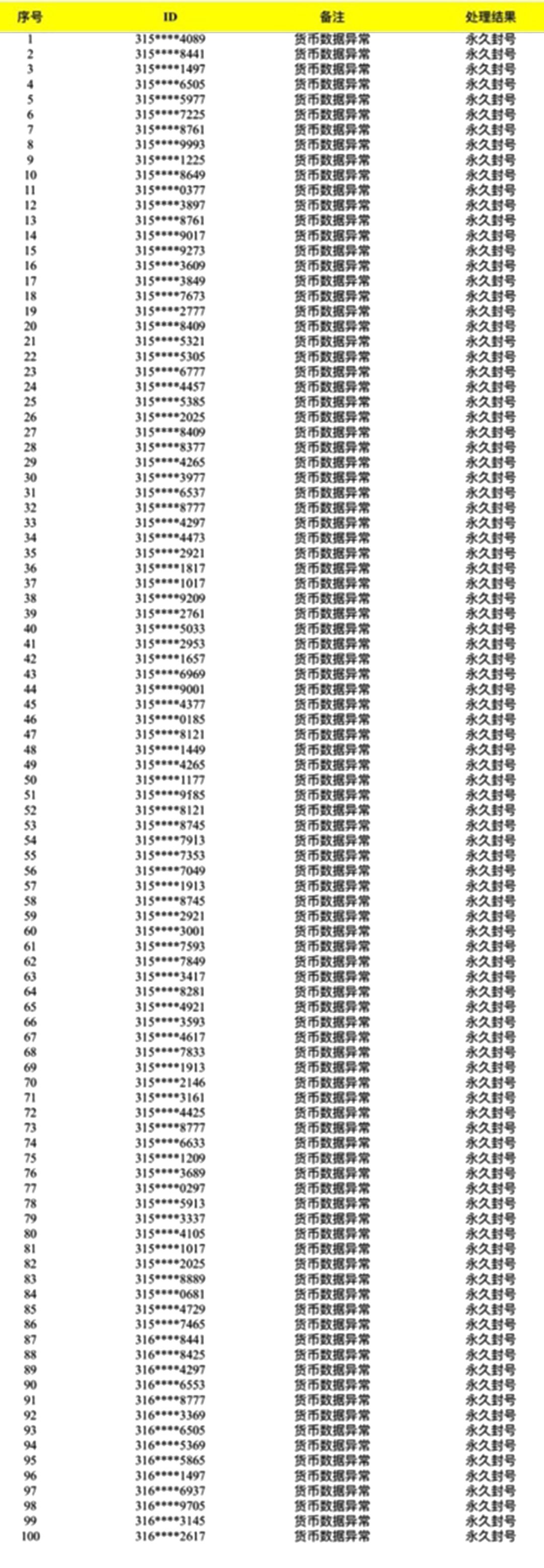 本次行动针对部分渠道账号进行核实,从严查处游戏内数据异常行为,市政工已收集了相关违规账号信息,并对这些玩家进行了永久封号处理,将于此公告中予以公示。