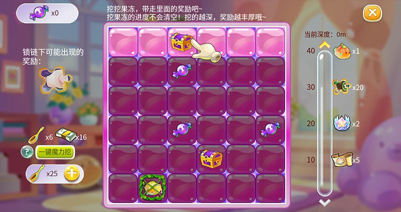 在挖挖果冻环节,努力向下挖掘,挖的越深奖励越丰富!在这里要努力收集糖果哦!