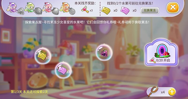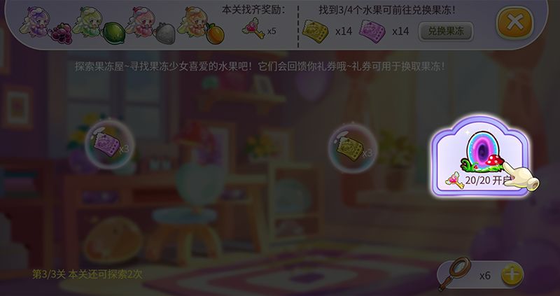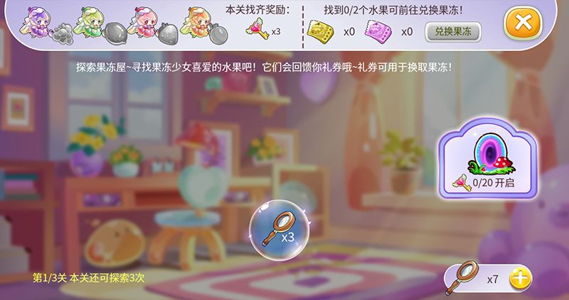 点击放大镜探索果冻屋,收集礼券并寻找水果。