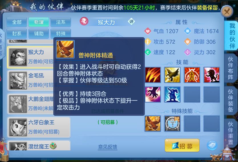 属性和技能选择:猴大力的专属技能和天赋技能直接强化自身输出,没有与己方单位联动,故在保证携带专属天赋后,按照队伍需求选择通用的物理技能天赋即可,比如狂战、恃强凌弱、奋战,其中奋战是非常契合万兽的技能,适合所有万兽伙伴。