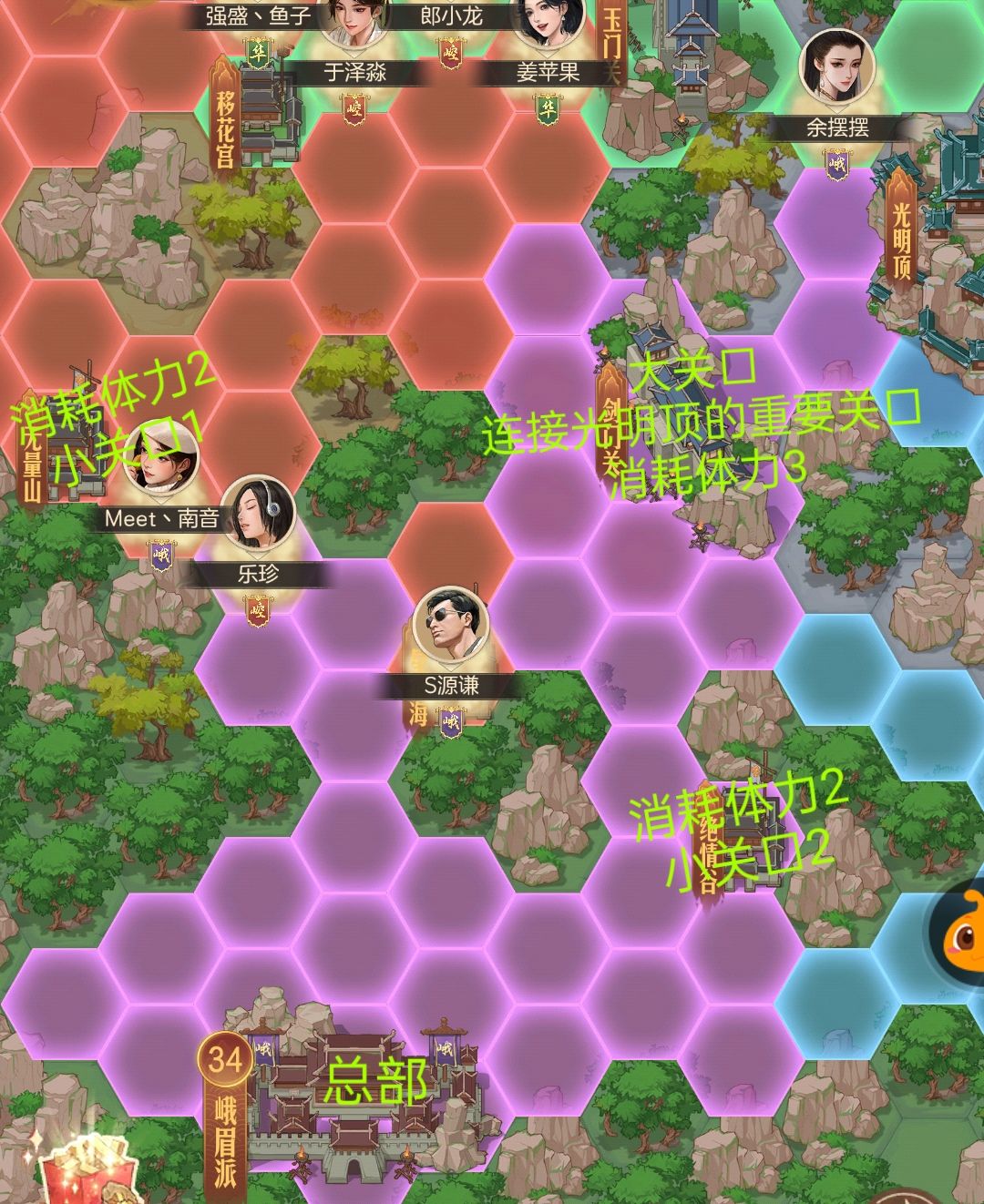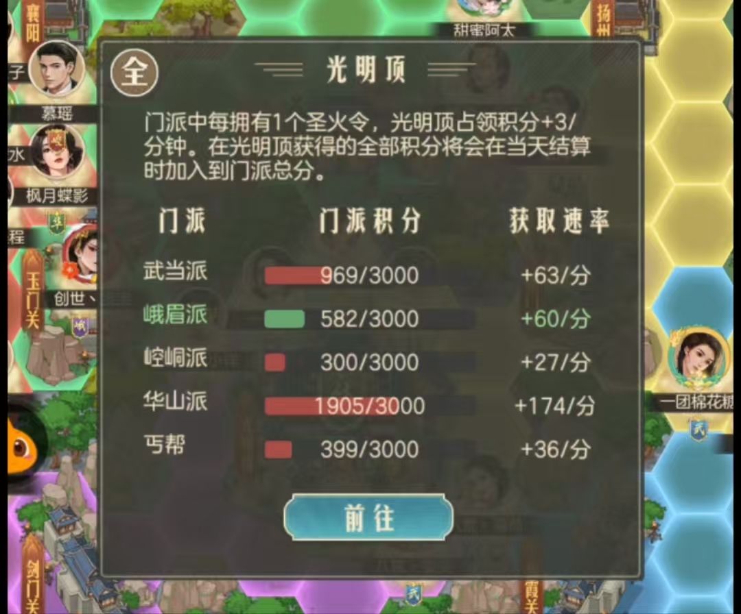 要去往光明顶,必须道路连通才能打,我们一定要预留一些体力在晚上,一起打通光明顶的道路,保证门派成员可以通往光明顶拿圣火令。