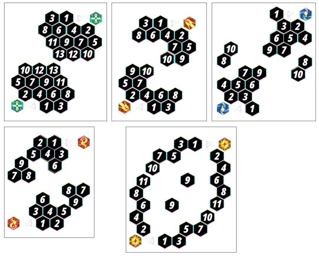 A2:以下是竞技场的5张图(其中图6和图5一样)。每一张图上的站位用数字标识了,其中数字越大越靠前,数字越小越靠后。知道这个后,回响生效的对象就不会搞错了。