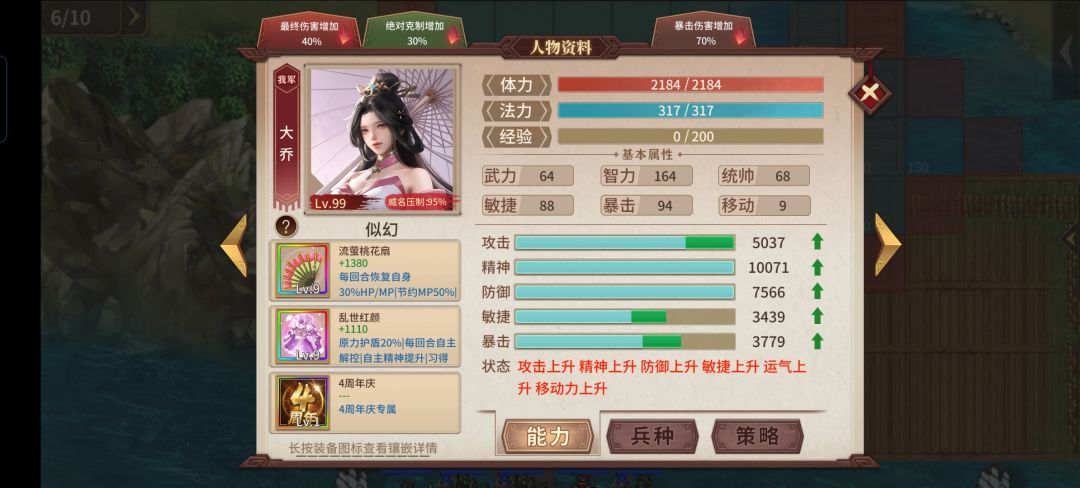 思路:本关可行动仅5个回合,因敌方虎步(避守)、长卫(毒阈、原力)、神箭(麻阈)的存在且站位分散,较难实施吹风速战,故采用常规的肉吸引、辅助配合主力推图的打法,因此出战人员移动能力、自主解控、行而后动等技能都非常重要。