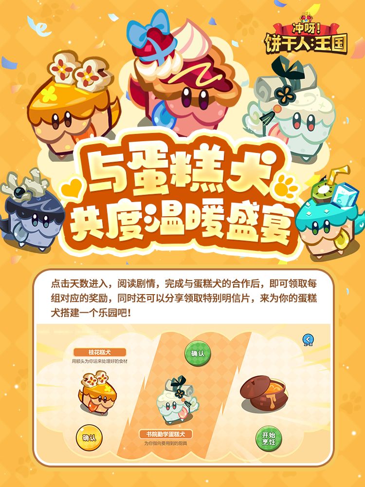 ——每日阅读剧情,完成与蛋糕犬的合作后,即可领取每组对应的奖励,同时还可以分享领取特别明信片!来为你的蛋糕犬搭建一个乐园吧!