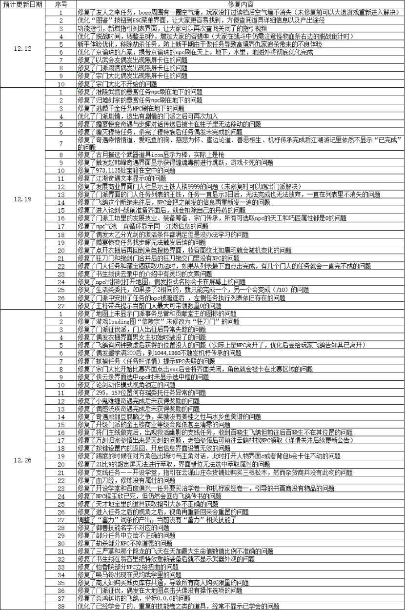 除开性能优化、NPC优化、世界生态部署、剧情割裂优化外、以及部分玩家建议落地外最重要的就是江湖2上线至今遗留老BUG的修复!这次我们通过外网、微信群、以及大家游戏里提交的BUG清单整理出以下还存在于游戏里的所有BUG,并注明档期排期修复,还请各位大侠过目!