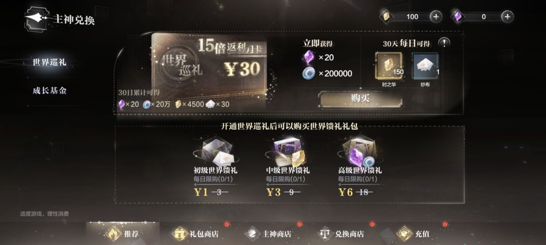 礼包商店推荐买2紫钻的时之华补给,性价高等于6紫钻换了1抽;