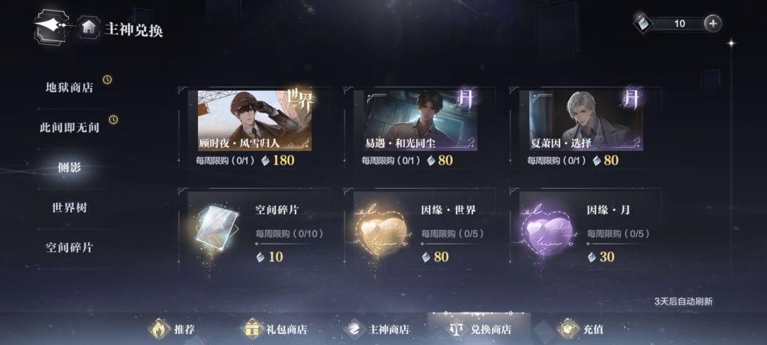 兑换商店主要在侧影里面换世界卡面,180每周刷新一次,不是特别推荐去换,除非特别喜欢又没有
