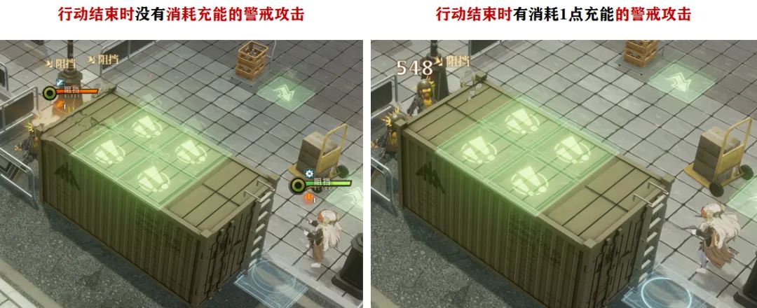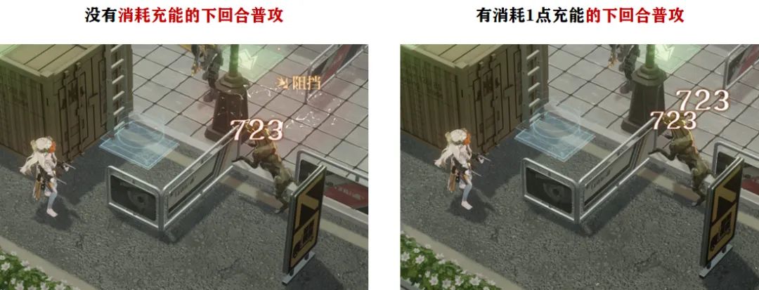 而针对这个充能在回合结束时自动使用后的无视1点阻挡的效果,大家从上图就能看到区别了,例如被动回合的警戒攻击和下个回合的主动攻击我们都能享受到无视对方1点阻挡的效果,此外这个充能,在满级技能的前提下,1技能【风中飘摇】可以开场即使用,能提供2点充能,相当于至少可以抗2回合的自动消耗,接着2技能【直到终点】可以提供1点充能,第2回合即可使用,所以在第2回合结束时,我们一般还剩下1点充能,第3回合就算不用技能也够自动消耗,等到第4回合靠着辅助的帮助,我们就又可以释放1技能了,相当于理论上而言这个充能是可以不断的。