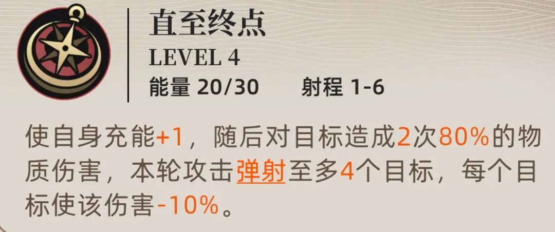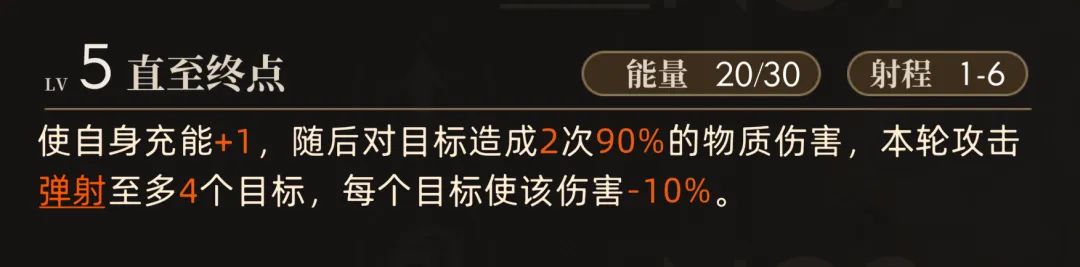 然后劳拉的2技能【直到终点】可以使劳拉获得1点充能,随后可以造成弹射至4个目标的伤害,最多就是攻击5个敌人。
