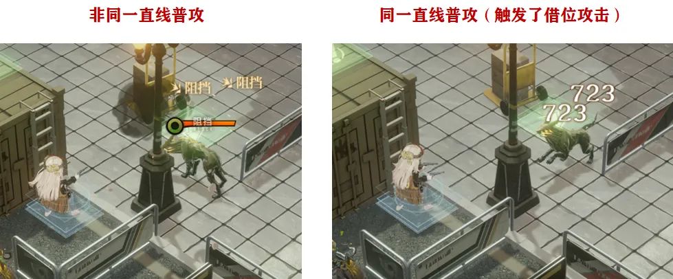 那么针对第一个直线普攻即可无视对方阻挡的效果,大家直接参考上边的两幅对比图即可,我们在用劳拉时也可以注意下她的走位,尽量和敌人处于同一直线再进行攻击。(这个无视阻挡是可以直接无视对方2点阻挡的,例如第二幅对比图我的劳拉实在直线狗的直线处发起的攻击的,图上的这个攻击位置是触发了自动借位攻击后的站位,而这个攻击对比前一幅就直接无视了对方2点阻挡)