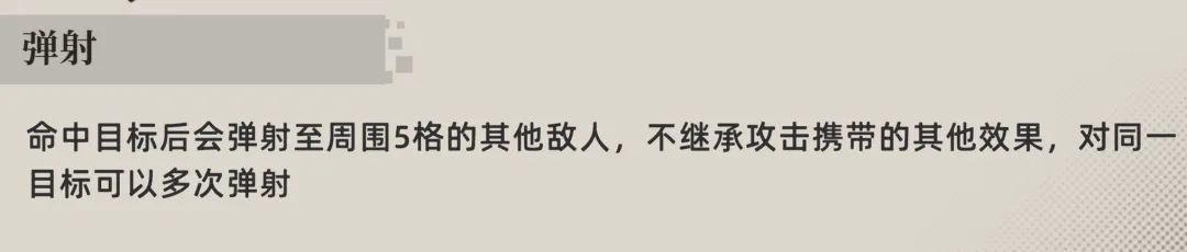 那么大家可以注意到这个2技能的“弹射”定义中,对比普攻的弹射多了一句,“对同一目标可以多次弹射”,那么经过实测,这个对同一目标可以进行多次弹射也是需要敌方身边有另一个敌人才行,如果弹射范围内只有1个敌人......则也只能对敌人造成1次弹射伤害,这点大家还请注意了。