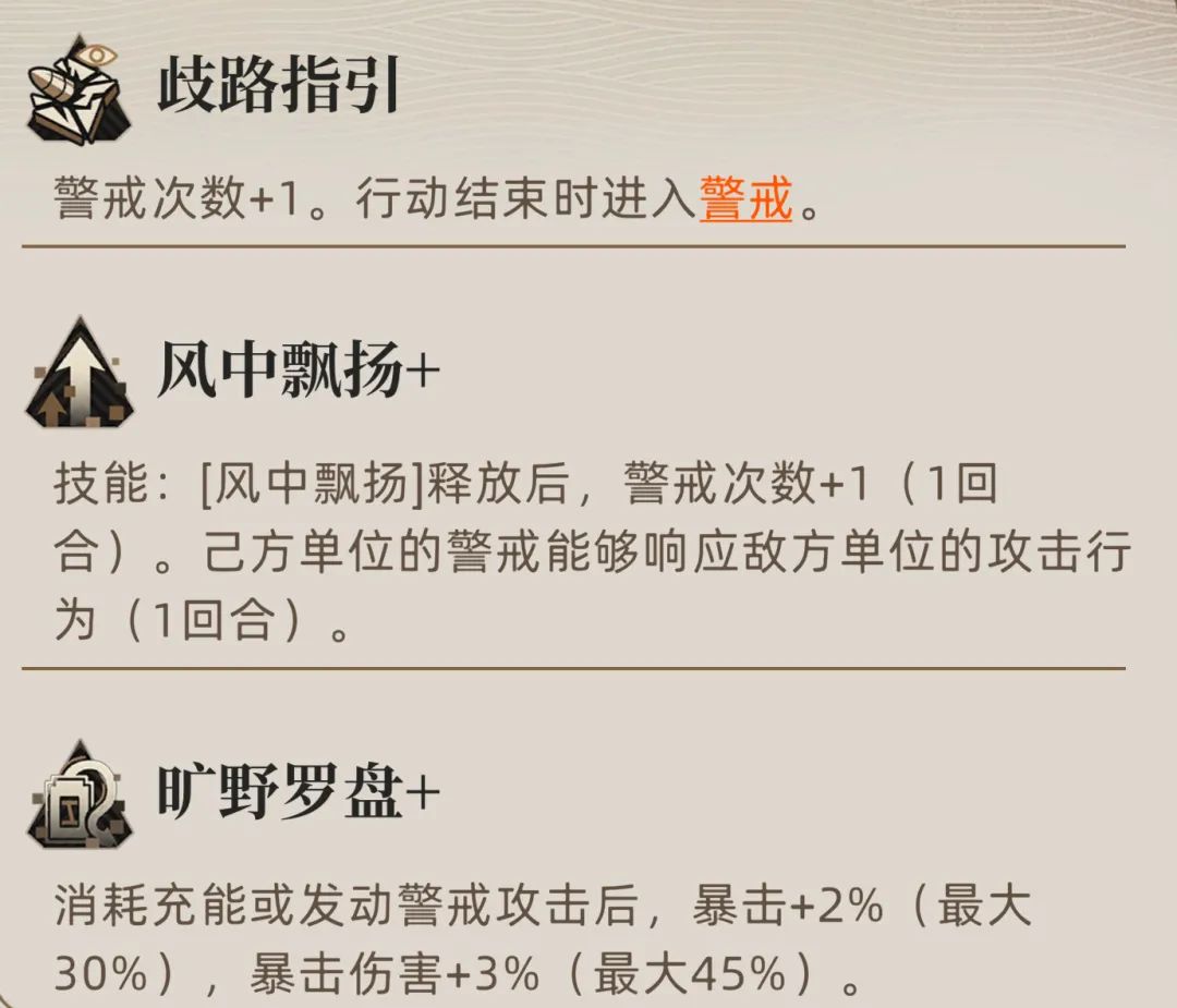 然后是特性方面的分析,第一个特性属于职业通用特性没啥可说的,而第二个特性“风中飘扬+”则是在释放了1技能后可以额外增加1次“警戒攻击次数”的效果,相当于每回合就能有2次的警戒攻击了,如果是达到了1拓变的话就是每回合最多3次的警戒攻击次数,能一定程度上提升劳拉在被动回合的输出效率,同时还有利于这个第三个特性中buff的积累。此外这个警戒能够响应敌方单位的攻击行为,其意思就是......如果对方是在我们的警戒范围内,但他却直接在原地就对方我进行攻击了,此时有了这个状态的劳拉便能在对方输出前先手进行警戒攻击,算是弥补了之前警戒输出的一个不足。