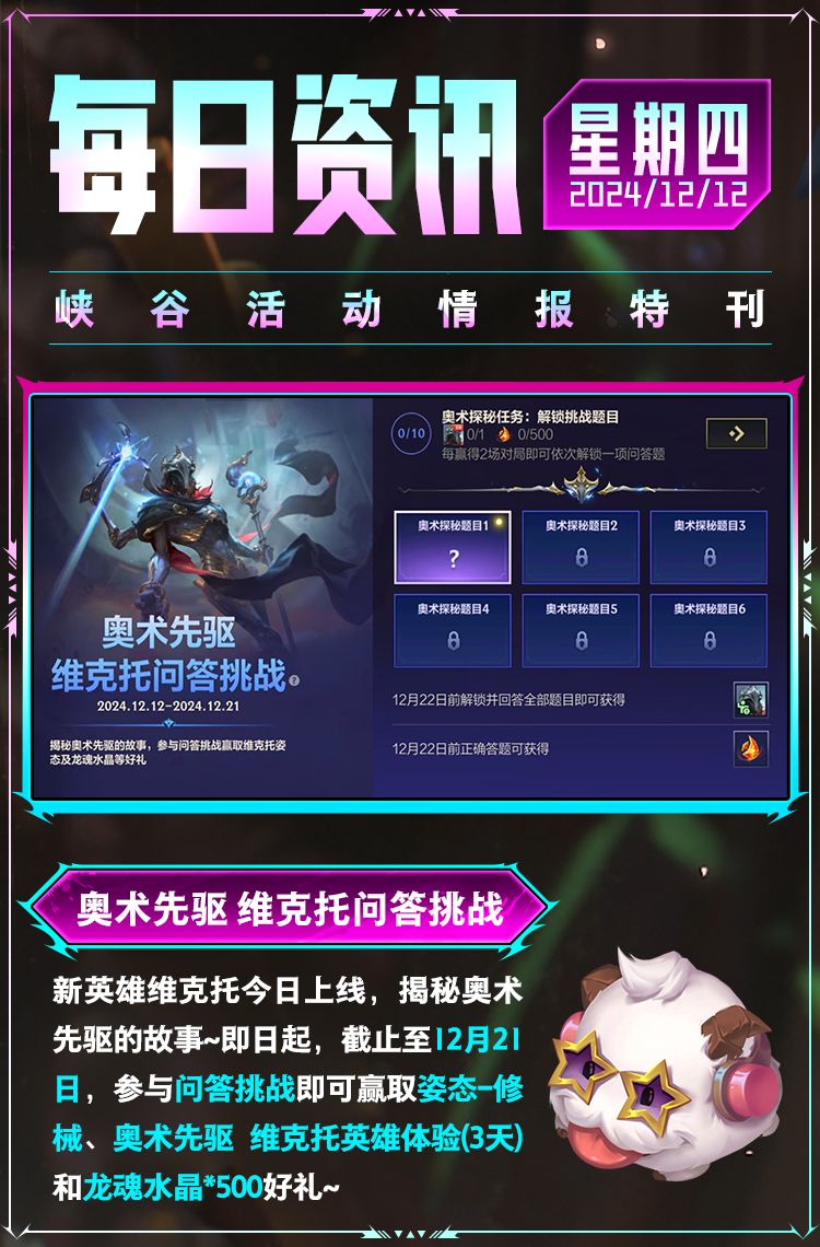 揭秘奥术先驱故事~即日起至12月21日23:59,召唤师参与问答挑战即可赢取姿态-修械、奥术先驱 维克托英雄体验(3天)和龙魂水晶*500好礼。