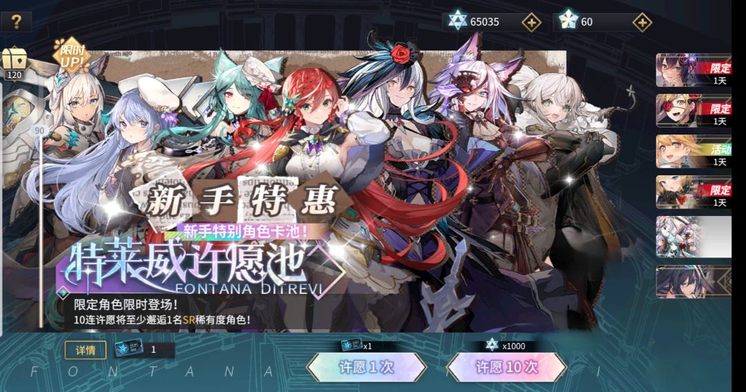 新手限定卡池获取角色、氪金卡池获取回响,卡池限时30天。30天内常驻票全部用在新手限定卡池(新手可通过通关主线、虚数回廊、常驻活动、紫薇星恒讨伐战商店兑换和新手挑战等获得大量常驻票)获取6属所需的限定角色。