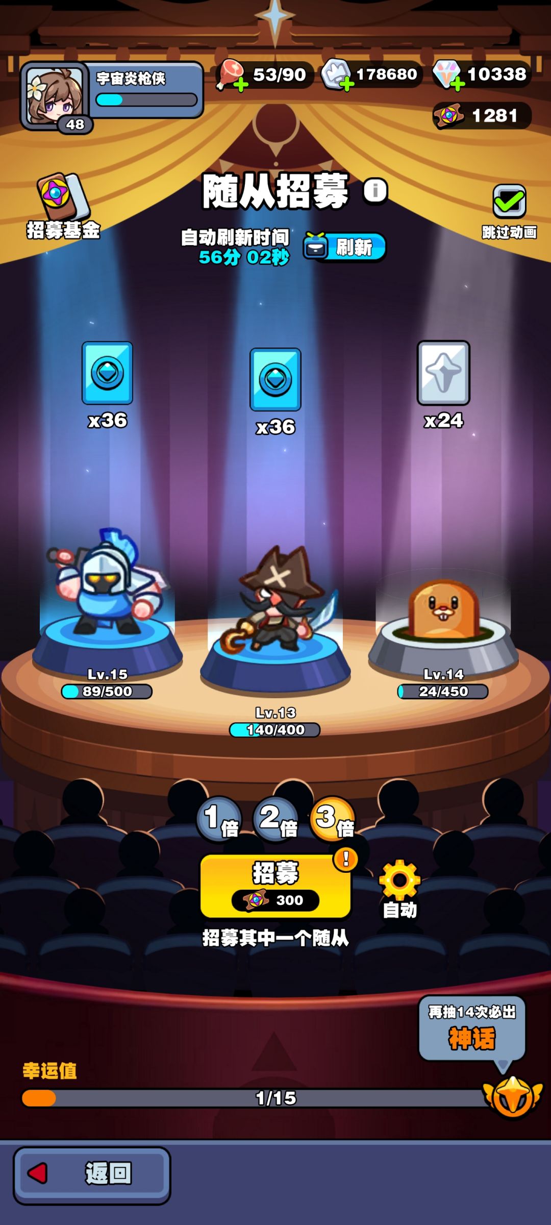 招募里面有10次刷新,建议萌新招募紫色角色的时候使用3倍召唤,抽中就抽,抽不中也不用砖石去抽奖,抽到神话再使用砖石抽奖,蓝色角色骑士特别强,也可以遇到骑士的时候3倍抽骑士