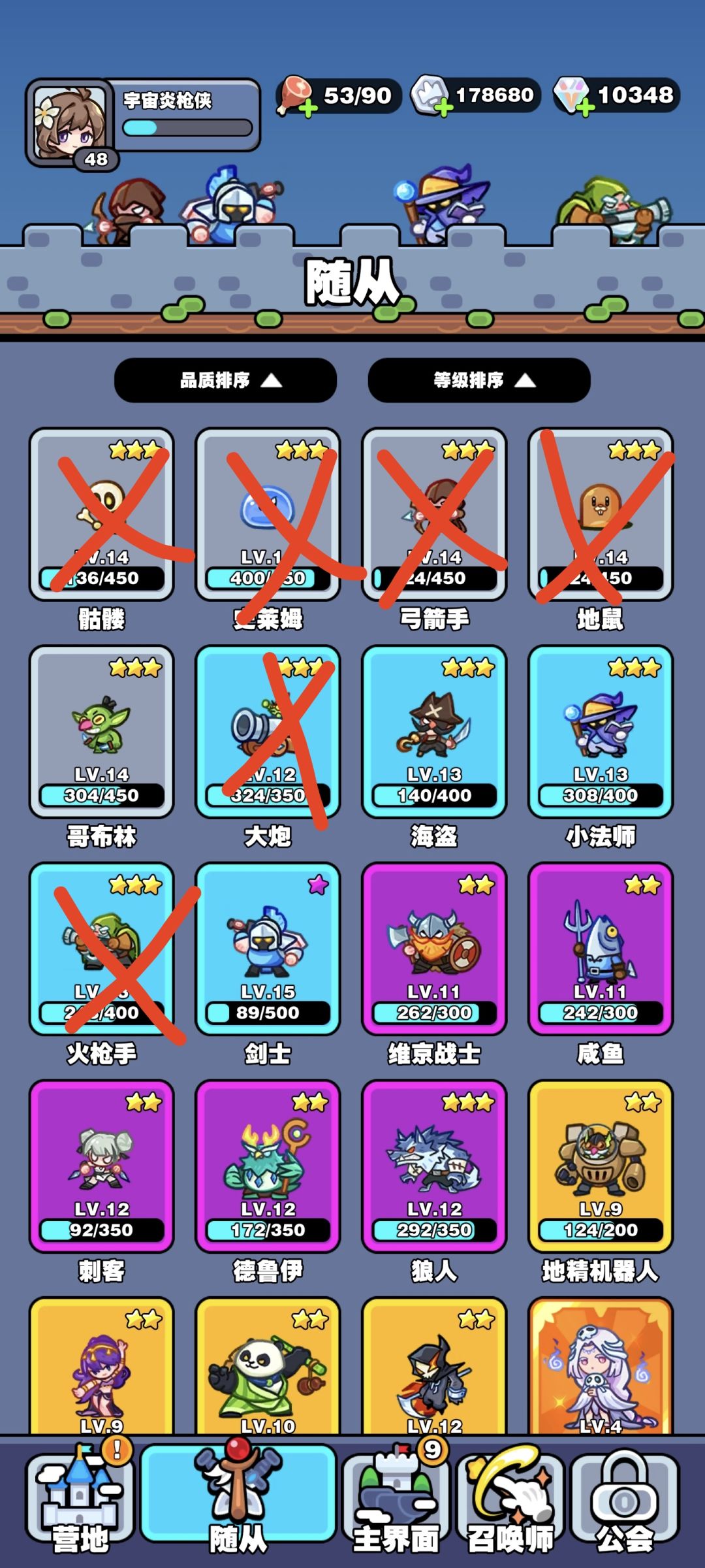 小法师(可以合成狐狸,灯神),炮车(可以合成忍者猫,招财猫),海贼(前期可以用来打控制,后面就出售或者合成紫卡)