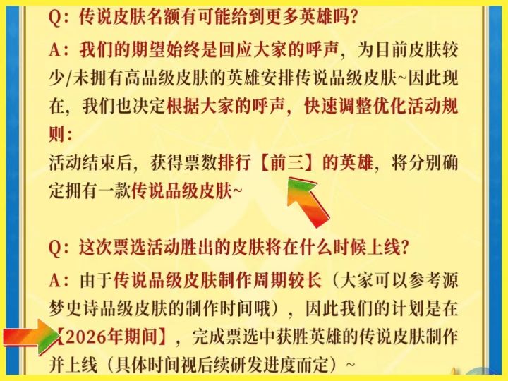 正式改成获得票数(前三名)的英雄都可以分别定制一款传说品级皮肤