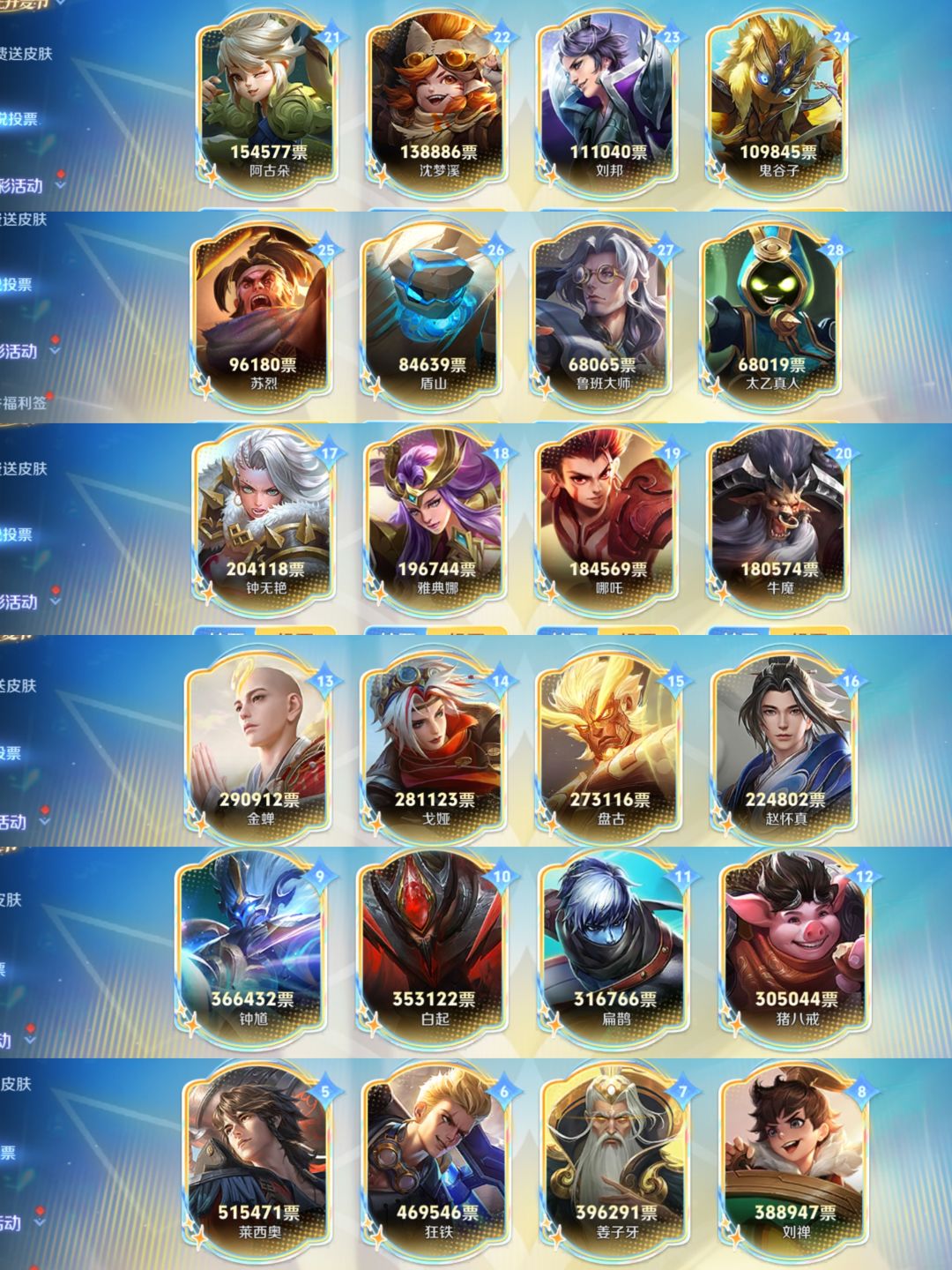 看了一通好像辅助的票数,感觉都有点低啊,大家今天都投给哪个英雄了啊?