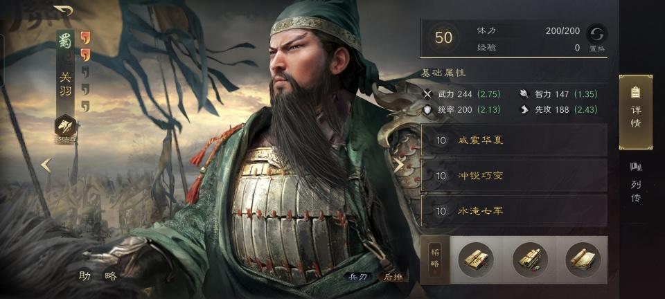 关羽战法:威震华夏+冲锐巧变+水淹七军。韬略库:励心善本+王预(专属)+机动善本。轻骑兵特性疾驰,专精点亮骁勇善战。