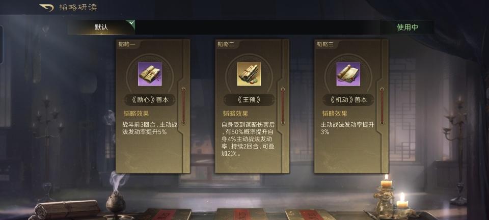 左慈战法:云行雨施+折冲御侮+避其锐气。韬略库:合战善本+太清(专属)+守土善本。铁骑兵特性坚韧,专精点亮铁马金戈。