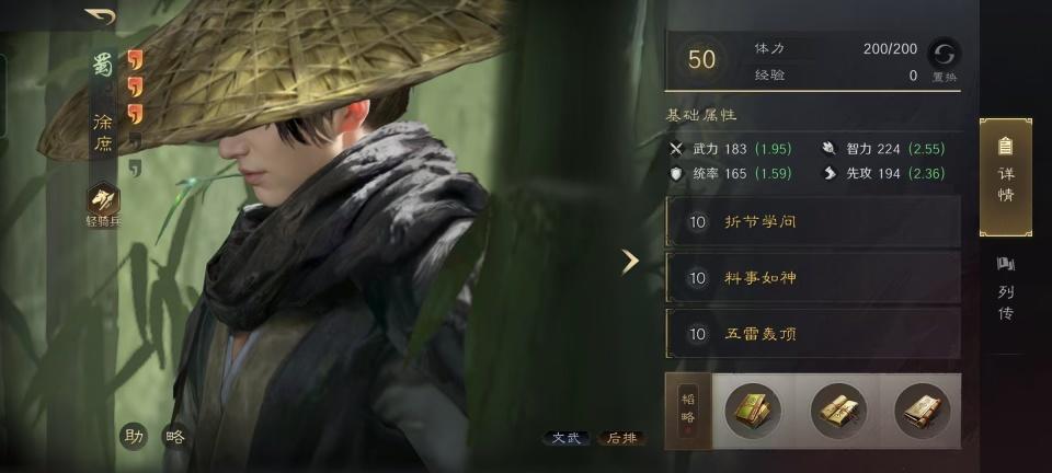 徐庶战法:折节学问+料事如神+五雷轰顶。韬略库:侠略(专属)+文武善本+兼资善本。轻骑兵特性疾驰, 专精点亮骁勇善战。前排的左慈换成了重骑兵形态,这是相对重盾兵而言比较少见的情况,当然为了追求更高的坦度也是无可厚非。不过最让人感觉给力的,还是关羽和徐庶之间的水雷联动。