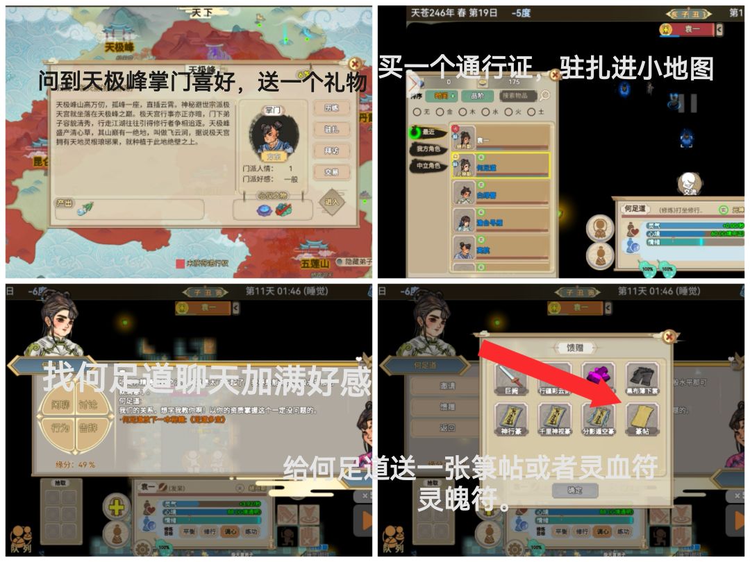 在自己门派装备一张没有画符纸,再进小地图,加满好感度再送礼,一定要加满好感度。