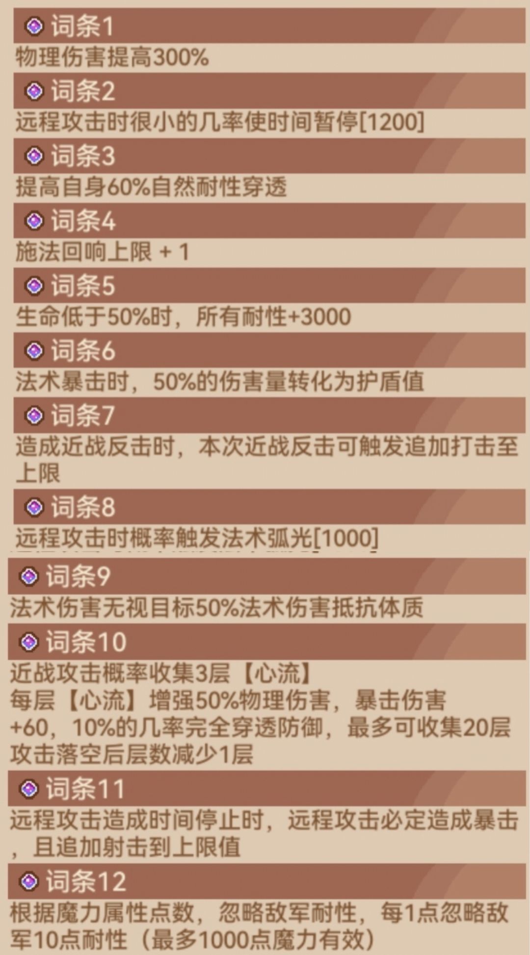 零阶词条...先算算吃满的加成吧。法力真伤可以不看了,会有法师指望那么几千万的伤害吗。造成射击伤害提升120%,稀。武器触发强度提升180%,开心超人都不玩了还能说什么。施法回响逐级衰弱惩罚减少10%,額,删掉其实也问题不大,对本体法和法宠都没明显影响。弧光伤害+100%,有点用。100战术,440%倍率不到的东西闹麻了。