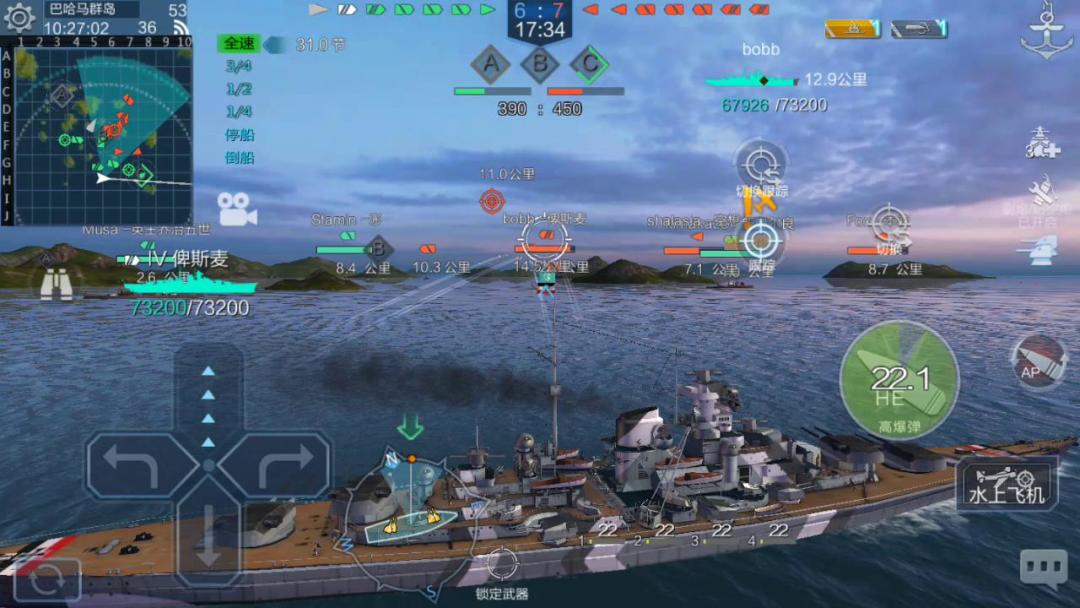 俾斯麦战列舰装配380毫米装甲板,从实战的效果来看,战舰装甲防护力强。如上图所示,战舰先后遭到三艘敌军舰的主炮打击,顿时船身起火,可战舰的血量仅仅掉了不到一半,然后我及时采取补救措施,战舰血量恢复到70%。随后虽再遭攻击,俾斯麦号战舰最低血量维持在3000左右,从而使得战舰出色的完成任务。这都归功于战舰装甲强大的防护力。