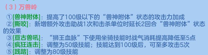 疯狂连击跟践踏都是等级调整。这波对低等级玩家来说,绝对是大幅加强。您要不玩万兽可能不太了解,万兽为啥强?变身后,一手飞击面伤能力惊人,一手连击暴杀单体目标。这下卡69的玩家也能享受下连击的快乐了。
