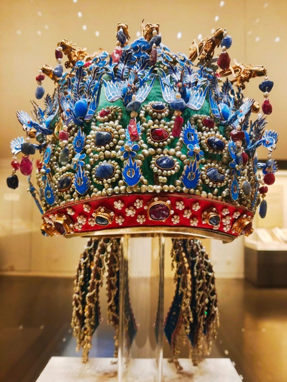 6:九龙九凤冠:价值30w铲币,重量20kg,用漆竹扎成帽胎,面料以丝帛制成,前部饰有九条金龙,口衔珠滴,下有八只点翠金凤,后部也有一金凤,共九龙九凤。冠上共嵌未经加工的天然红宝石115块,珍珠4414颗该冠上面翠鸟的羽毛光泽感好,色彩艳丽,再配上金边,显得富丽堂皇,且永不褪色……#代号超自然 #投稿