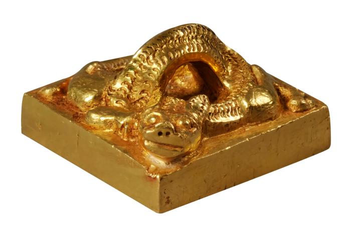 3.行玺金印:价值30w铲币,不知经历了多少风吹雨打还是依旧辉煌大气不失光彩的黄金龙钮金印,它打破了秦汉时期天子用玺的传统,以白玉为材料、螭虎为钮式的规定,展现了其不凡的气派。