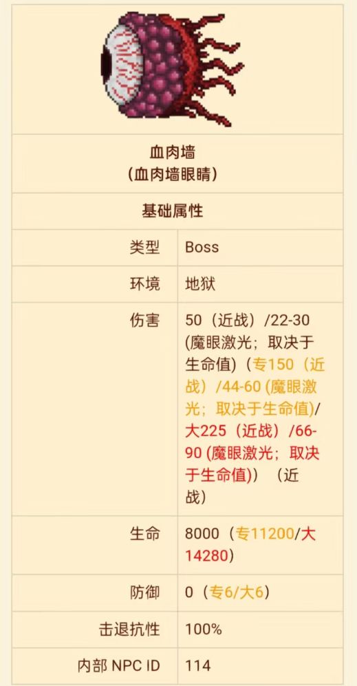 血肉墙(肉山)是泰拉瑞亚世界进入困难模式之前的最难BOSS。只会在地狱中生成,当你击败血肉墙之后,你所在的世界就会永久的改变,变得更加的困难,到时候可能杀个小怪都会被小怪反杀,不过只有击杀肉山,才会新增新的BOSS和地形