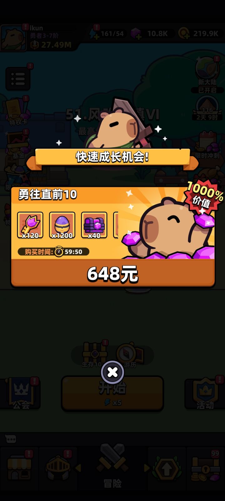 如图,微氪356,靠着越战和越勇,还有雕像的加持,一天时间从40冲到50,武器还是刚削废的风语。