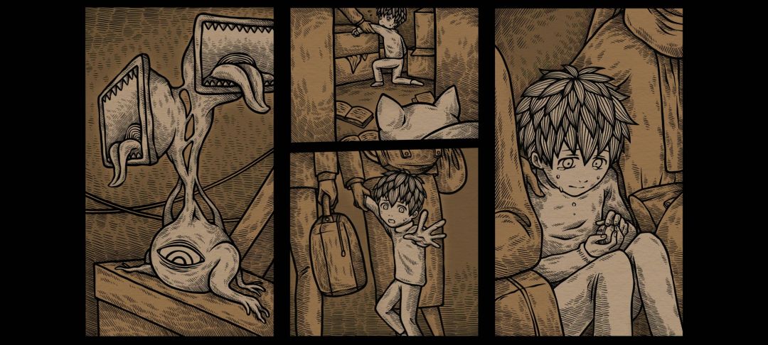 接着就是那对兄弟在剧情中说那个怪物背上似乎背着什么东西,那个不是东西,是他弟弟的尸体,背着他的是他的哥哥,然后最后结尾拿出来的物品是一卷绷带,我推测可能是哥哥拿着绷带将呃残疾的弟弟背在身上,佝偻身躯向远方走去,然后骗弟弟说会有吃不完的饼干和冰淇淋在远方等着他们,最后死的那一刻还互相搂在了一起