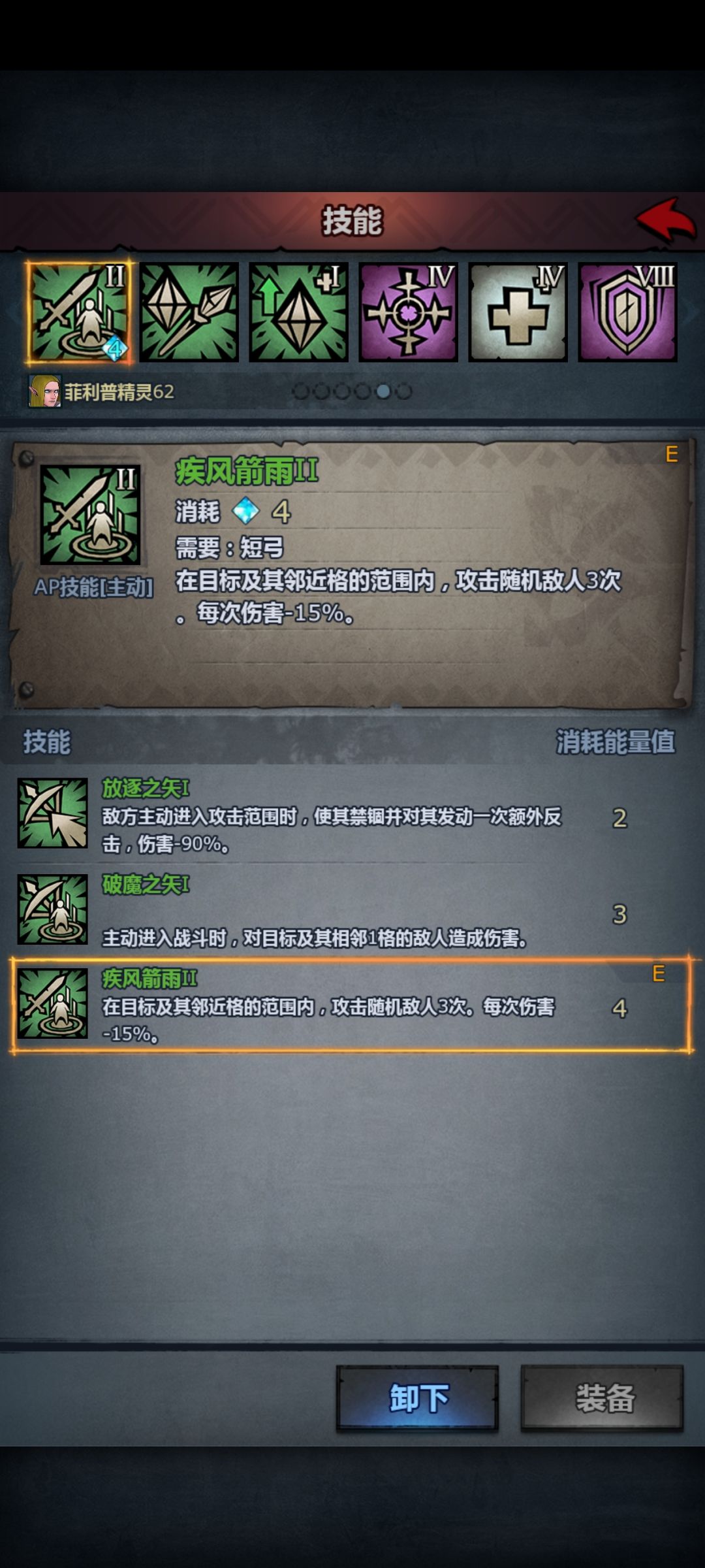 (1)AP主动技能:疾风箭雨V,攻击随机敌人5次,每次伤害-30%