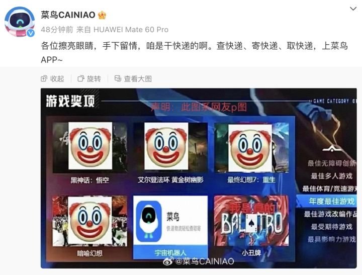 菜鸟APP官方微博也就此事做出回应:“各位擦亮眼睛,手下留情,咱是干快递的啊。”