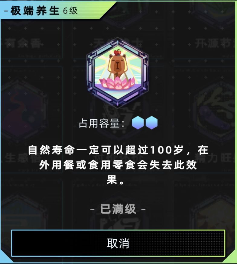 极端养生:两格天赋,适合没有抽到寿命枝丫玩家获得百年天赋,但是不能在外面吃饭吃零食,适合传代档,不适合开局档。