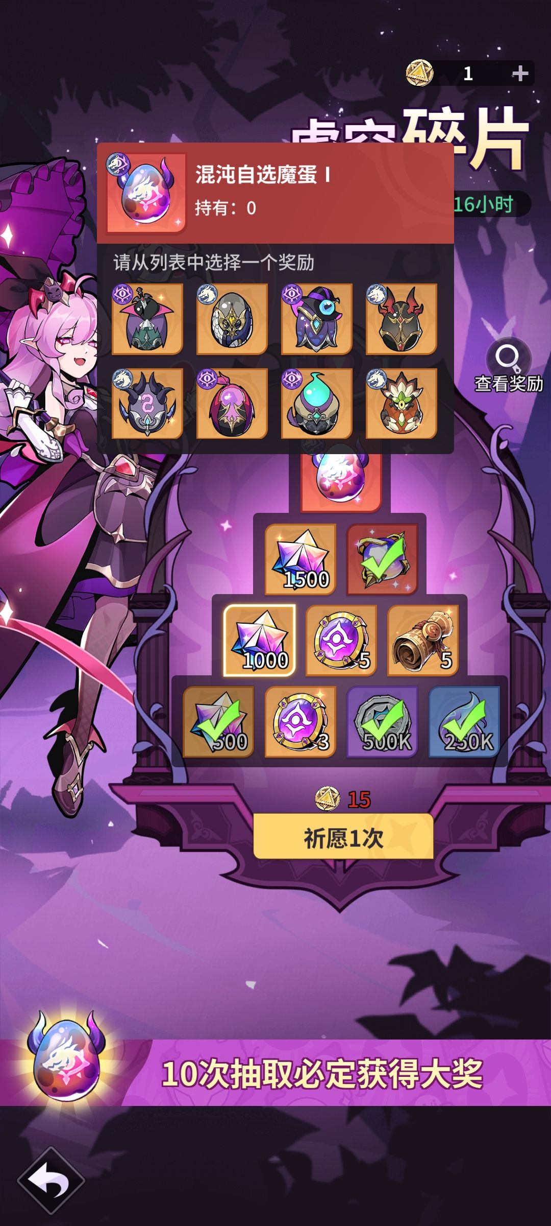 前期可以刷商店的600钻的魔核,或者1000钻直接买也行,反正刚开始魔核池子15抽内必出一只魔族或者龙族,后面想出难得很,只能出碎片合成,至少我抽了200多抽快300抽的魔核,就只出了3只还是4只完整的,所以后面就随缘,主要就是靠60换一只自己要的。